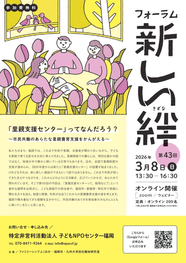 私たちのまち・福岡では、これまで市民や里親、支援者が関わり合いながら、子どもを家庭で育てる営みを大切に育んできました。里親家庭での暮らしは、特別な誰かの話ではなく、地域の中で静かに続いている日常でもあります。近年、全国で里親制度の充実が進められ、2024年度からは新たに「里親支援センター」の設置が始まりました。けれどもそれは、単に新しい施設ができるという話ではありません。これまで市民が担ってきた支えやつながりを、これからどのように引き継ぎ、広げていくのかが、あらためて問われています。