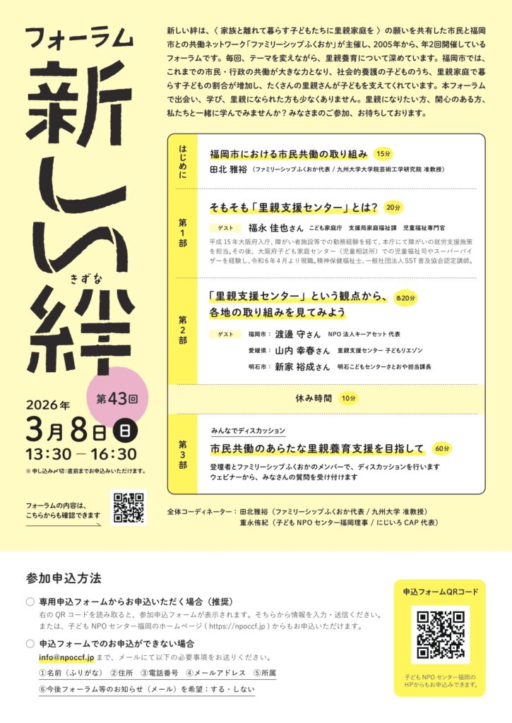 そこで第43回の今回は、「里親支援センターって、結局なに?」という素朴な疑問を出発点に、こども家庭庁の担当者や、福岡市・愛媛県・明石市で実践に関わる方々を迎え、制度と現場、市民が出会うこれからの里親養育支援の姿を考えます。福岡で積み重ねてきた経験を足がかりに、市民共働のあり方を参加者のみなさんとともに探っていきたいと思います。